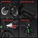 Dual disc brakes front and rear, along with electronic brakes, significantly enhance braking performance and shorten braking distance. Additionally, custom front and rear disc brakes provide extra riding protection. Safety LED headlights and bike bells make you safer when going out, especially at night, as cars and pedestrians can see and hear you.