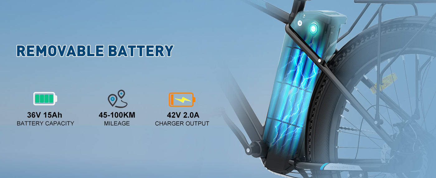Large Capacity Battery: The durable, removable 36V 15Ah lithium-ion battery ensures a seamless and uninterrupted ride. In Pedal Assist Mode, you can travel between 45 to 100 km, making it ideal for long-distance rides and daily commutes. The charging time is typically 6-7 hours, allowing riders to charge overnight and set off on a new journey at sunrise.
