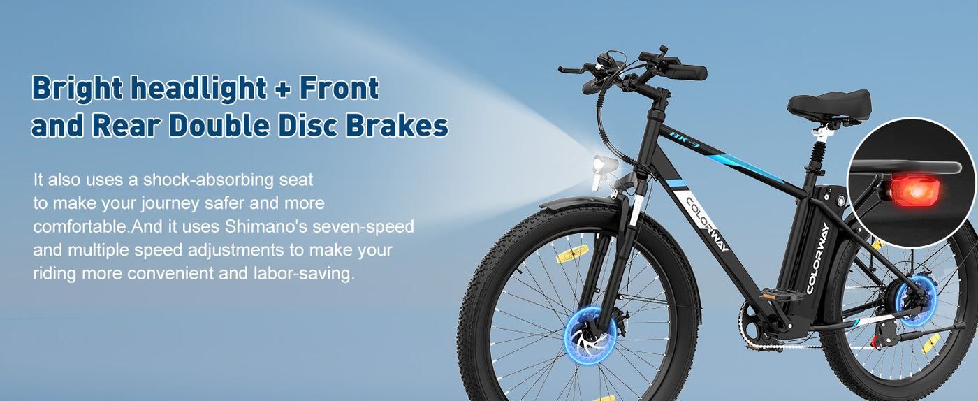 Safe Riding: Front and rear dual disc brakes, along with electronic braking, significantly improve braking performance and reduce stopping distance. Custom disc brakes offer additional safety. For added security, the bike is equipped with LED headlights and a bike bell, ensuring you are visible and audible to both cars and pedestrians, especially at night.